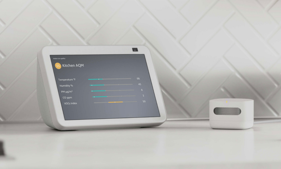 Factors it tracks are particulate matter (PM), volatile organic compounds (VOCs), carbon monoxide (CO), humidity, and temperature. You can see readings any through the Alexa app.