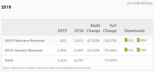 For the first two months of 2019, total revenues notched NT$1.63 billion – a 72.8% decline versus the same time a year ago.